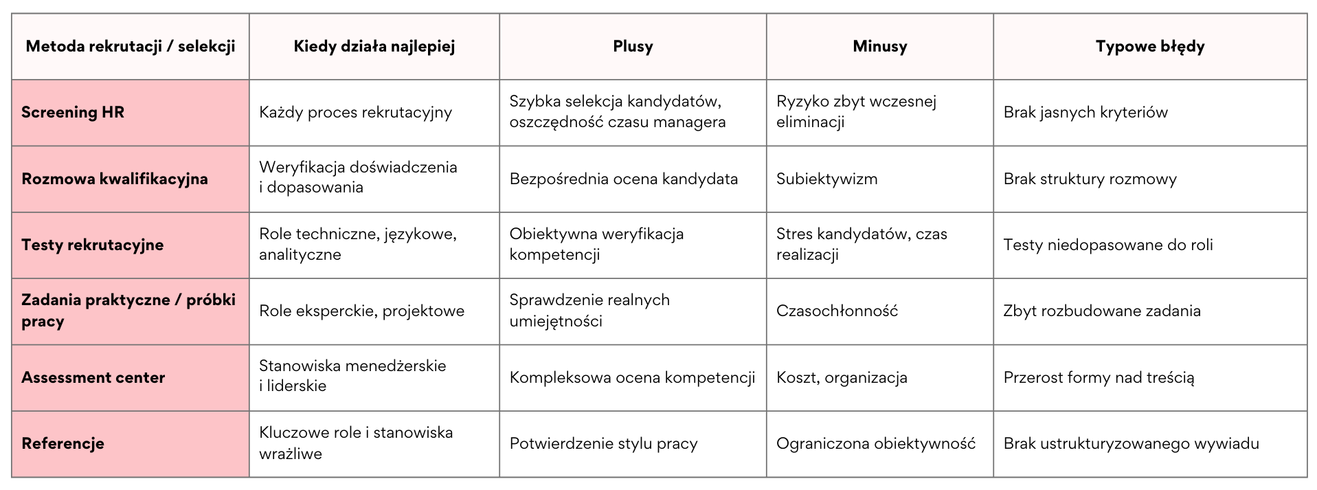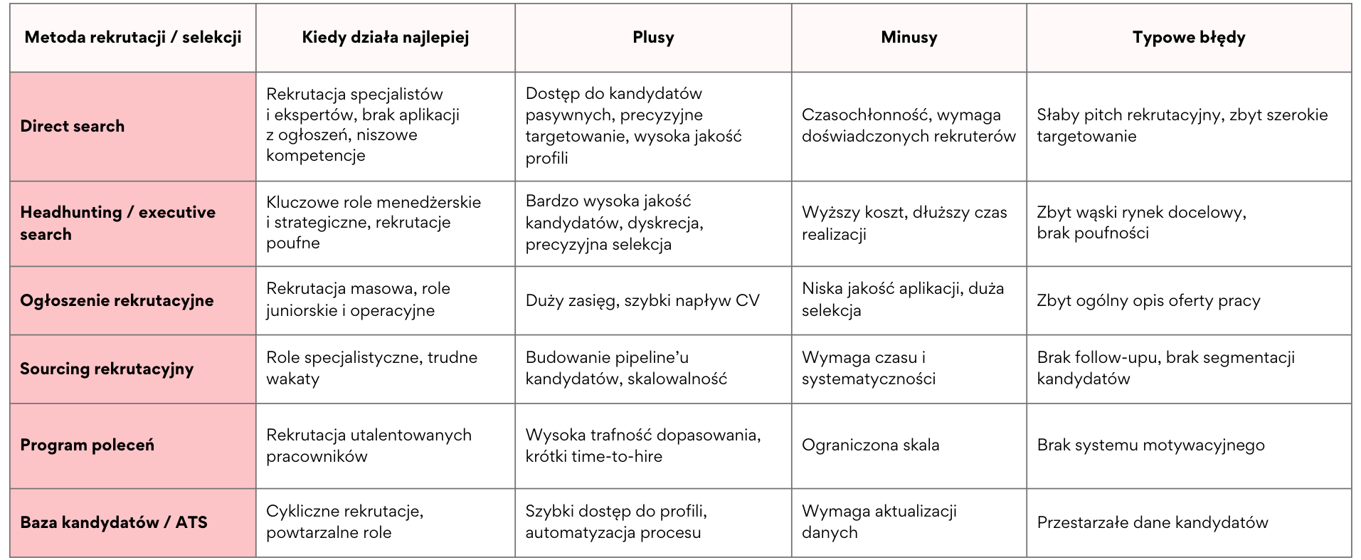 Rekrutacja specjalistów to dziś jedno z największych wyzwań stojących przed działami HR. Nie tylko ze względu na ograniczoną dostępność kompetencji, ale również ze względu na aktualną sytuację makroekonomiczną. Z jednej strony na rynku pracy utrzymuje się relatywnie niskie bezrobocie, co oznacza, że pula dostępnych kandydatów pozostaje ograniczona. Z drugiej strony obserwujemy wyraźne spowolnienie tempa wzrostu wynagrodzeń oraz coraz ostrożniejsze podejście firm do planów zatrudnieniowych. Coraz więcej sygnałów płynących z gospodarki, zarówno ze strony sektora produkcyjnego, jak i usługowego, wskazuje na wyhamowanie dynamiki wzrostu oraz większą ostrożność w podejmowaniu decyzji inwestycyjnych. W takim otoczeniu wielu specjalistów zaczyna postrzegać zmianę pracodawcy jako decyzję obarczoną większym ryzykiem niż jeszcze kilkanaście miesięcy temu. Stabilność zatrudnienia, bezpieczeństwo finansowe i przewidywalność projektów zyskują na znaczeniu, a motywacja do aktywnego poszukiwania nowej pracy wyraźnie słabnie. W efekcie rośnie liczba kandydatów pasywnych. Wysoko wykwalifikowanych ekspertów, którzy posiadają atrakcyjne kompetencje, ale nie są aktywni na rynku pracy i nie aplikują na ogłoszenia. To dodatkowo utrudnia rekrutację nowych pracowników i sprawia, że klasyczna rekrutacja z ogłoszenia coraz rzadziej przynosi oczekiwane rezultaty. Firmy muszą dziś konkurować nie tylko o kompetencje, ale również o zaufanie kandydatów, którzy w warunkach niepewności gospodarczej znacznie ostrożniej podchodzą do decyzji o zmianie pracodawcy. W takich realiach skuteczna rekrutacja specjalistów wymaga jeszcze lepszego przygotowania procesu, precyzyjnego dotarcia do właściwych kandydatów oraz umiejętności budowania wiarygodnego, biznesowego argumentu przemawiającego za zmianą pracy. To właśnie dlatego coraz większego znaczenia nabierają direct search, sourcing oraz profesjonalnie zaprojektowany proces selekcji, który daje kandydatom poczucie bezpieczeństwa i transparentności. W tym artykule pokazujemy proces rekrutacyjny krok po kroku – od diagnozy potrzeby biznesowej, przez dobór metod pozyskania kandydatów, aż po ofertę i onboarding. Skupiamy się na dwóch kluczowych celach: jakości dopasowania i skróceniu time-to-hire. Przedstawiamy konkretne procedury rekrutacyjne, narzędzia selekcji oraz praktyczną checklistę dla HR i managerów. Co to znaczy „dobrze zaplanowana rekrutacja specjalisty” i dlaczego procedury rekrutacyjne są kluczowe? Dobrze zaplanowana rekrutacja specjalisty to nie pojedyncze działanie, lecz przemyślany proces rekrutacyjny, który prowadzi organizację od zidentyfikowania potrzeby biznesowej, przez zatrudnienie nowej osoby, aż po jej skuteczne wdrożenie. Proces rekrutacji nowych pracowników powinien być traktowany jak projekt biznesowy, którego celem jest pozyskanie właściwych kandydatów w możliwie najkrótszym czasie, przy jednoczesnym zachowaniu wysokich standardów selekcji. Skuteczna rekrutacja pracowników nie polega wyłącznie na szybkim zamknięciu wakatu, lecz przede wszystkim na świadomym wyborze najlepszego kandydata, który realnie wniesie wartość do organizacji. W tym kontekście procedury rekrutacyjne pełnią rolę fundamentu całego procesu. To one określają, jak wygląda proces rekrutacji w danej firmie, jakie są obowiązkowe etapy rekrutacji, kto odpowiada za poszczególne decyzje oraz w jaki sposób przebiega proces selekcji kandydatów. Bez jasno zdefiniowanych zasad rekrutacji bardzo szybko pojawia się chaos organizacyjny, rozbieżności w oczekiwaniach oraz brak spójności w ocenie kandydatów. W praktyce brak procedur prowadzi do sytuacji, w której każdy kolejny przypadek rekrutacji przebiega inaczej. Inaczej prowadzone są rozmowy rekrutacyjne, inaczej interpretowane są kompetencje kandydatów, a decyzje podejmowane są w oparciu o subiektywne odczucia zamiast rzetelnej analizy. Taki sposób działania nie tylko wydłuża przeprowadzenie procesu rekrutacji, ale również obniża jego jakość i zwiększa ryzyko nietrafionego zatrudnienia. Wzorowy proces rekrutacji powinien obejmować wszystkie kluczowe elementy: od analizy potrzeb i przygotowania danych dotyczących stanowiska pracy, przez dobór odpowiednich metod rekrutacji, aż po przeprowadzenie rozmowy kwalifikacyjnej, ostateczną selekcję kandydatów i podjęcie decyzji o zatrudnieniu nowej osoby. Każdy kolejny etap procesu musi mieć jasno określony cel, zakres odpowiedzialności oraz termin realizacji. Właściwe przeprowadzenie rekrutacji pozwala nie tylko skrócić czas zatrudnienia, ale również poprawić wyniki wszystkich procesów w organizacji w długim okresie. Firmy, które inwestują w optymalizację procesu rekrutacyjnego, szybciej docierają do odpowiednich kandydatów, skuteczniej przyciągają utalentowanych pracowników i budują przewagę konkurencyjną na rynku pracy. W efekcie rekrutacja pracowników przynosi realną wartość biznesową, wspierając rozwój organizacji i stabilność zespołów. Kiedy ogłoszenie nie wystarczy – specyfika rekrutacji specjalistów i kandydatów pasywnych Na rynku specjalistów obowiązują zupełnie inne zasady rekrutacji niż w rekrutacji masowej. W wielu branżach, takich jak IT, inżynieria, logistyka, produkcja, finanse czy sprzedaż B2B, najlepsi eksperci bardzo rzadko aktywnie poszukują nowej pracy. Są zatrudnieni, rozwijają się w swoich organizacjach, realizują strategiczne projekty i nie przeglądają portali z ofertami pracy. Z perspektywy pracodawcy oznacza to, że rekrutacja nowych pracowników w segmencie specjalistycznym nie może opierać się wyłącznie na publikacji ogłoszenia. To właśnie w tym obszarze pojawia się określenie kandydat pasywny. Jest to osoba, która nie szuka aktywnie pracy, nie aplikuje na ogłoszenia rekrutacyjne, nie zawsze posiada aktualne CV, ale pozostaje otwarta na roz
